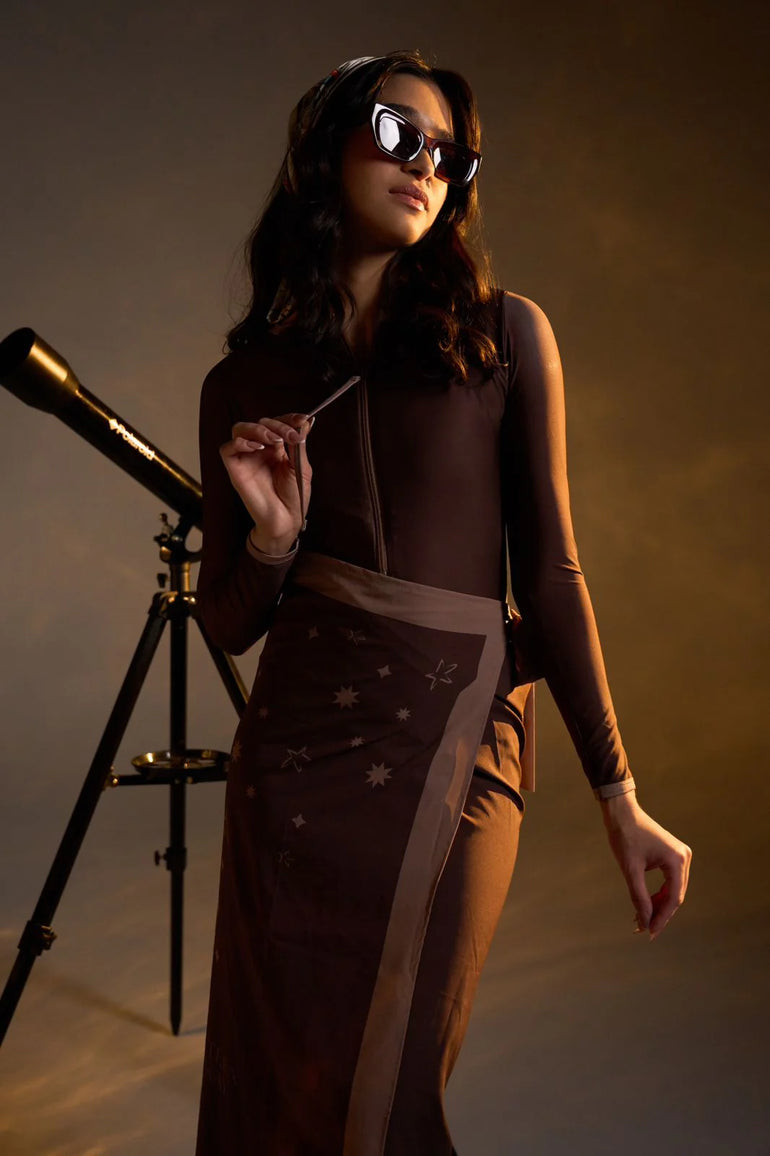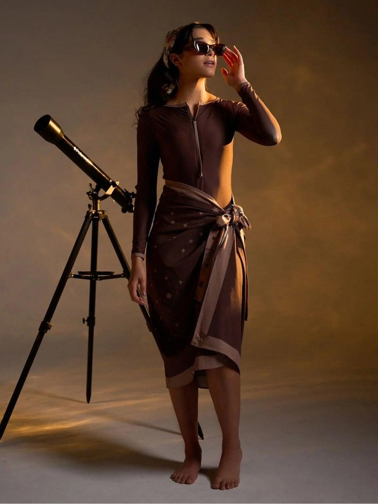 The Milky Way set, features a 3/4 sleeve bathing suit with contrast zipper in the front and built in top and bra cups for extra support. Paired back to a mid lenght wrap around skirt that offers full coverage, you can choose to wear tied at the side or as a skirt closed with the invisible buttons. The Pareo is made of swim proof material as well and will dry within minutes. Non see – through. A classy look that will have you summer ready!