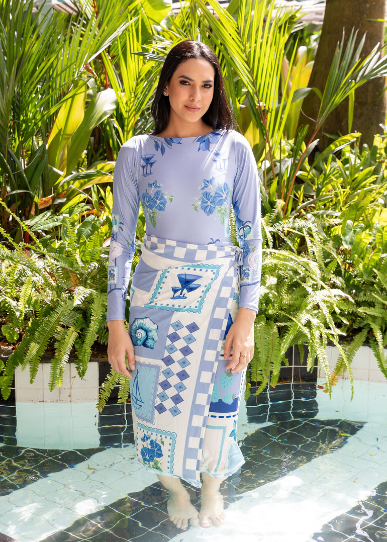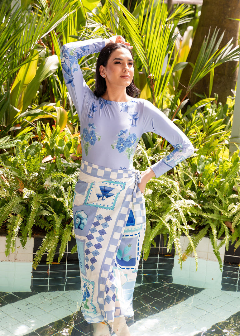 The Sicilia royale bathing suit set combines style and functionality, making it an essential addition to your summer wardrobe. This long sleeve bathing suit features built-in top and bra cups for extra support, ensuring you stay comfortable and confident. It pairs elegantly with a mid-length wrap-around skirt that offers full coverage, allowing you to choose to wear it tied at the side or as a skirt closed with invisible buttons. Made from swim-proof material, the pareo dries quickly and is non-see-through, perfect for beach days or poolside lounging.