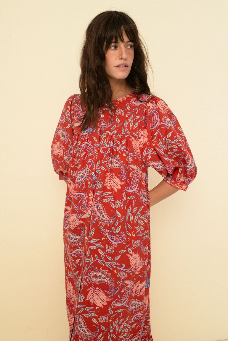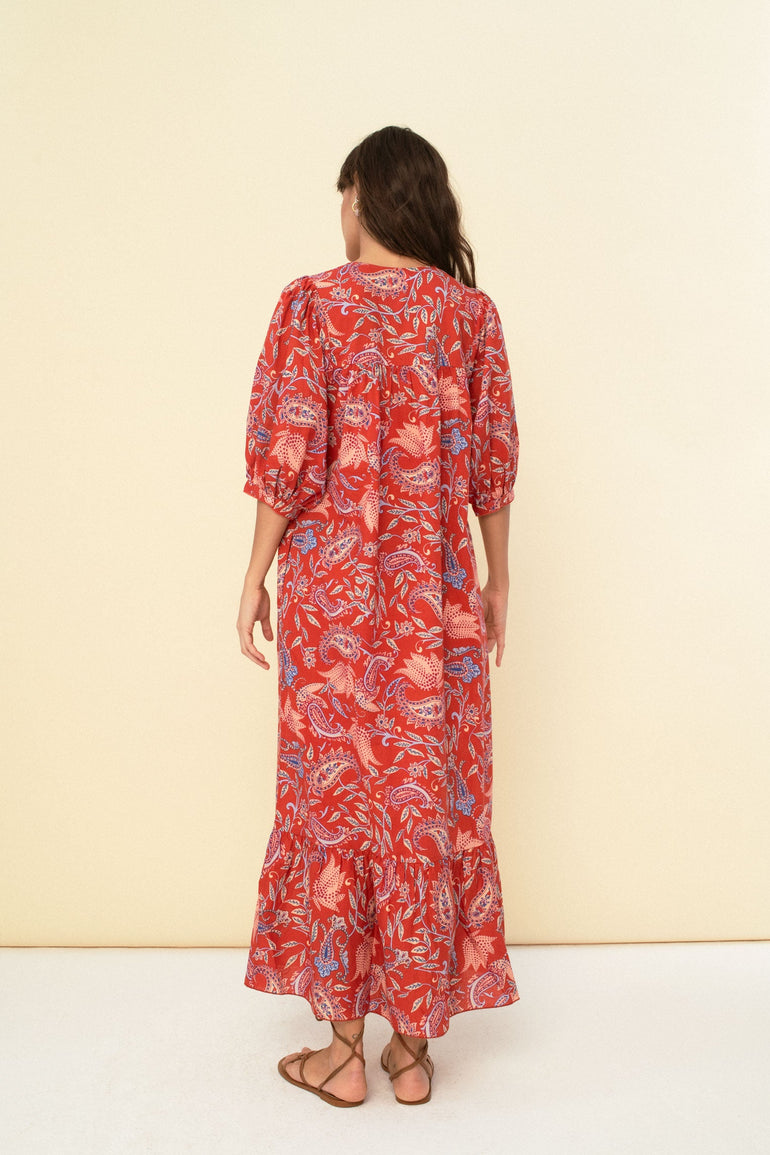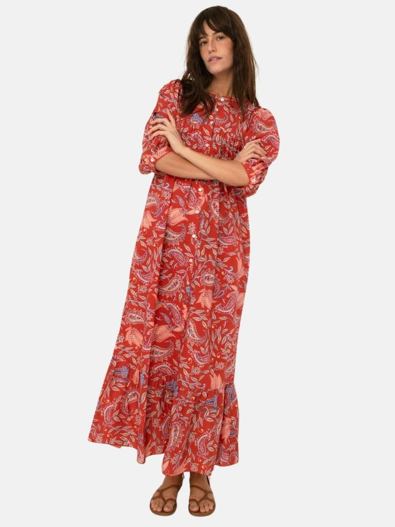 Our loved maxi dress Sofia features short sleeves covering elbow and front button closure