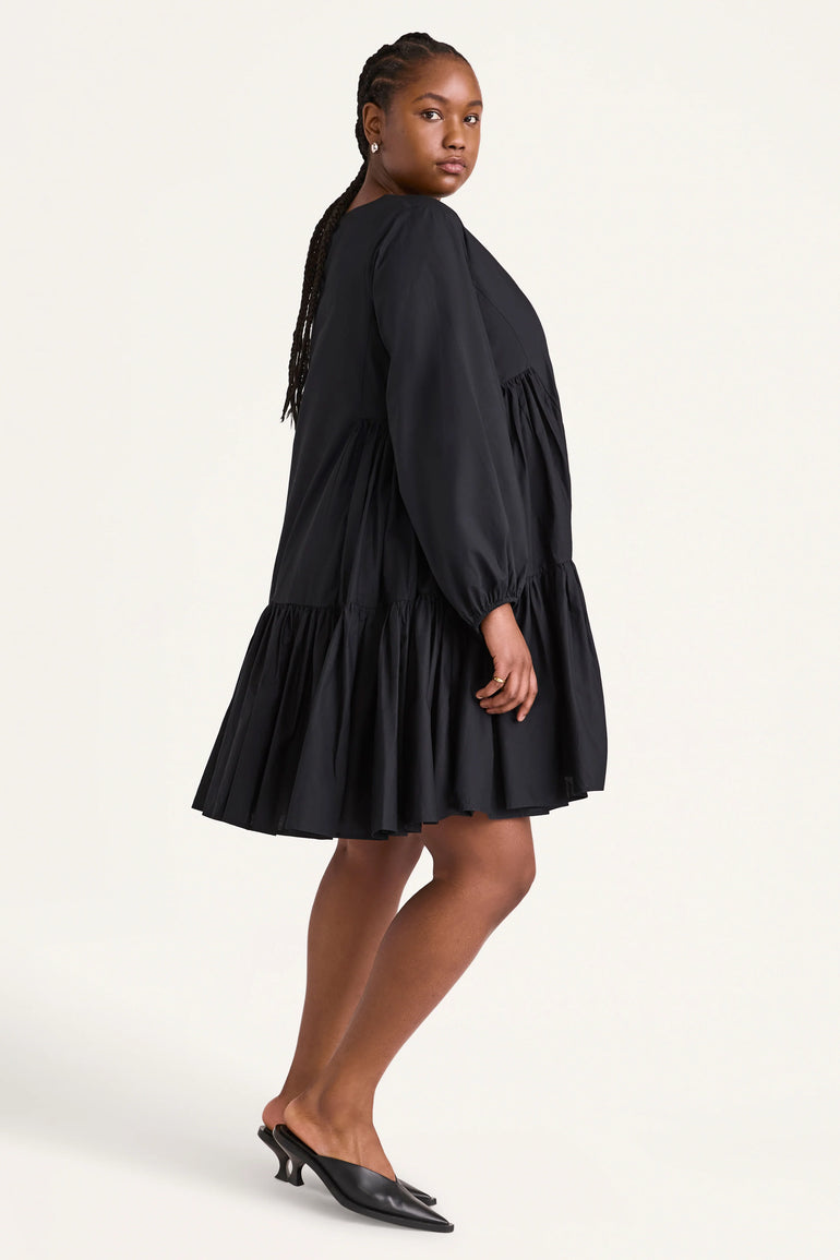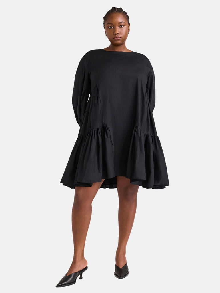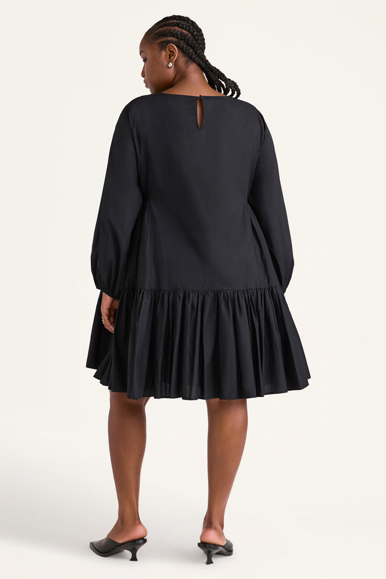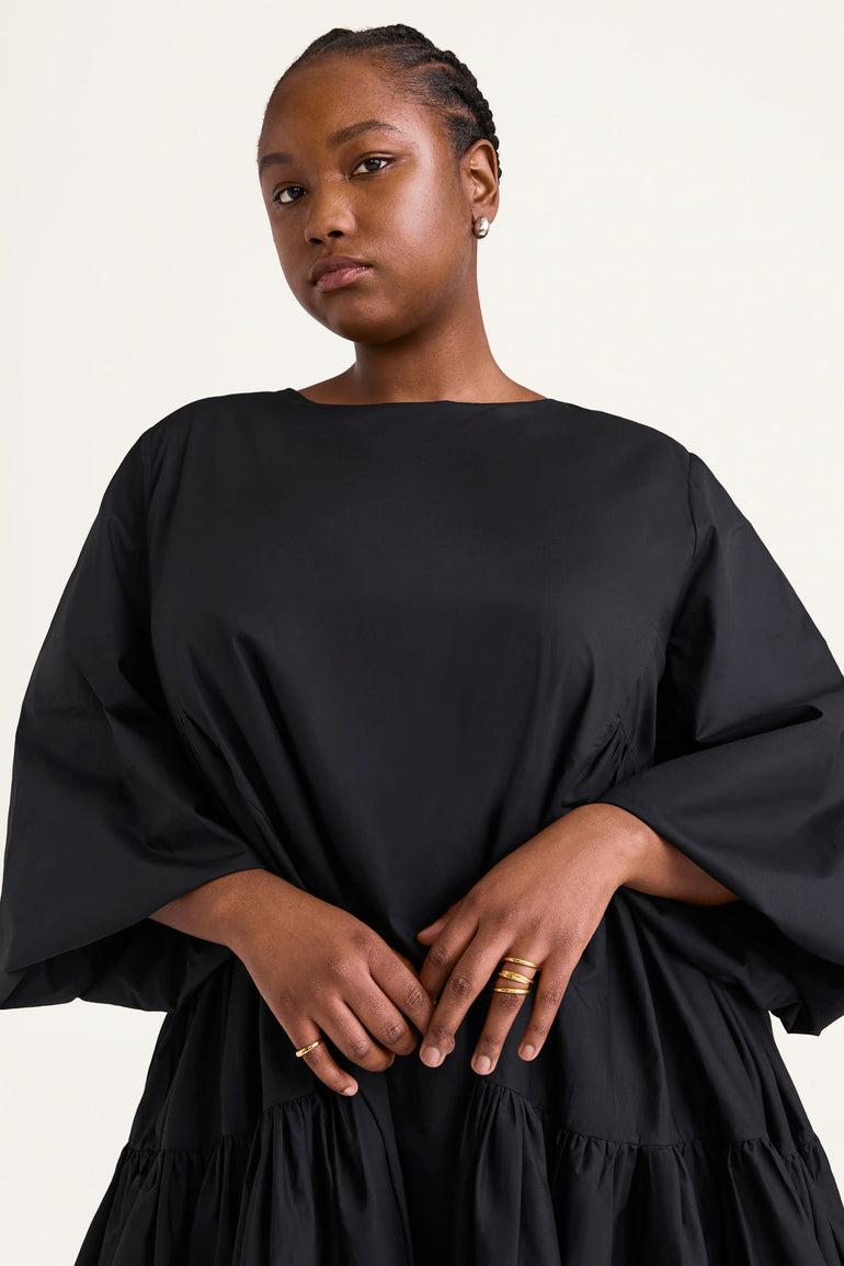 Effortlessly elegant in timeless black, the Byward Dress blends structure with softness in a design made for movement and grace. This modest black dress features a gently voluminous silhouette with two tiers of gathered side panels, adding subtle dimension and fluidity.