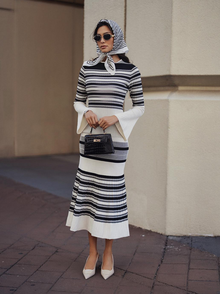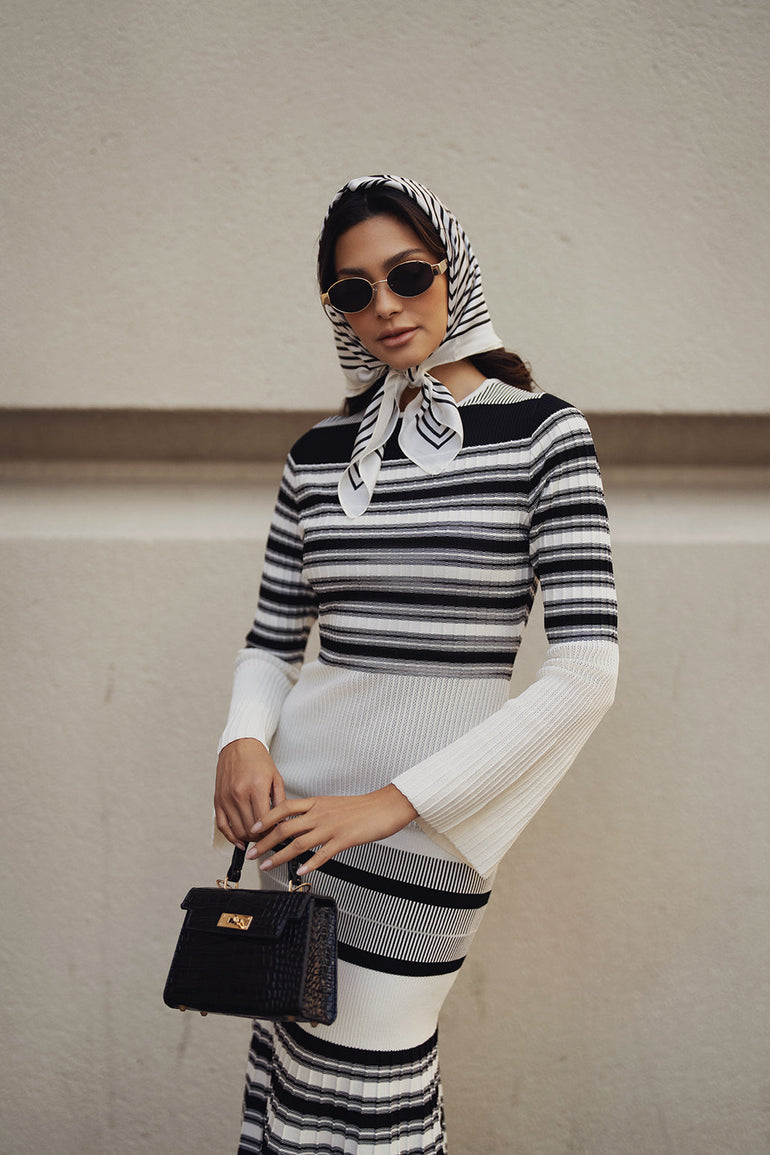The Black and White Knit Dress features a striking knit pattern with a round neck, bell sleeves, and a graceful maxi length for timeless elegance.