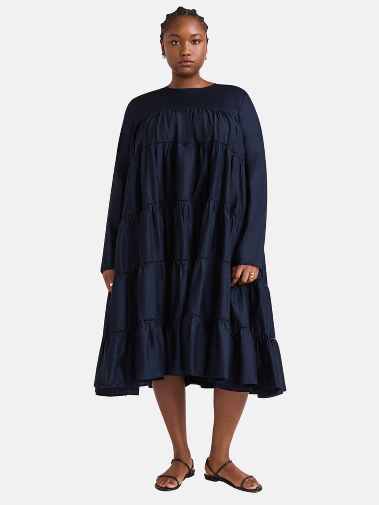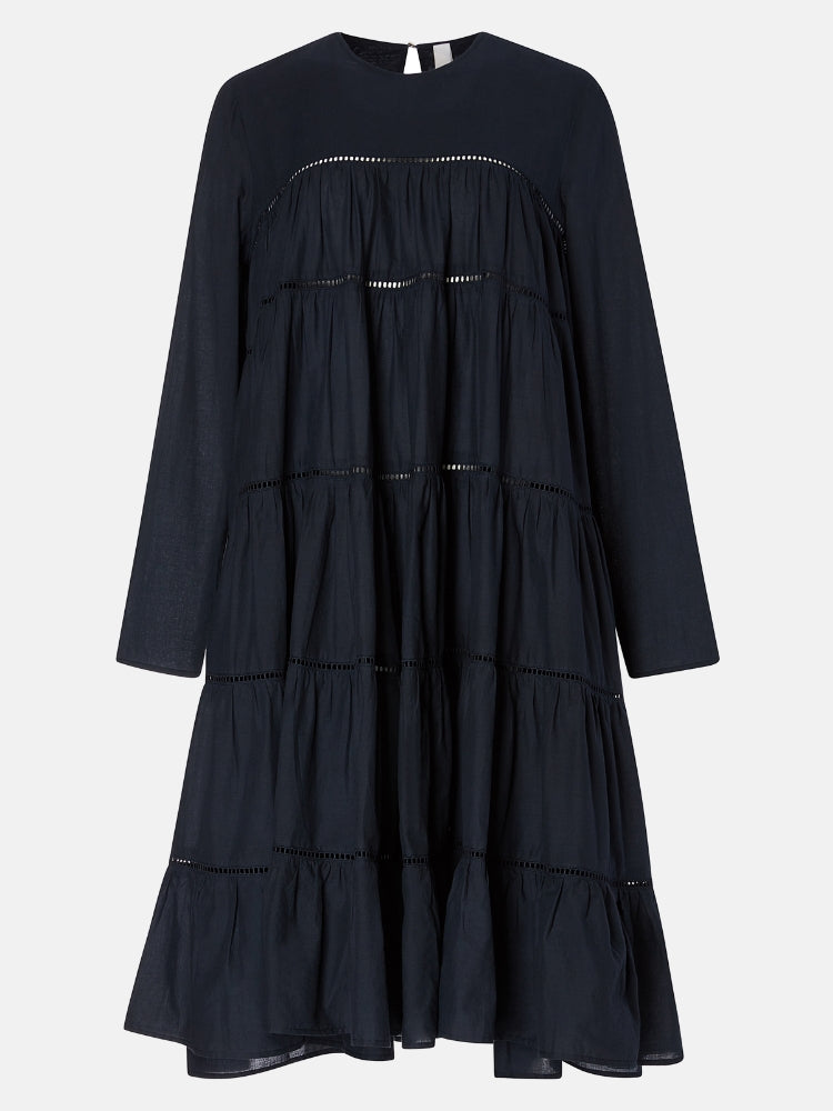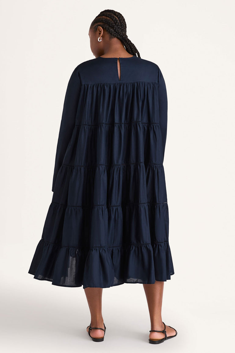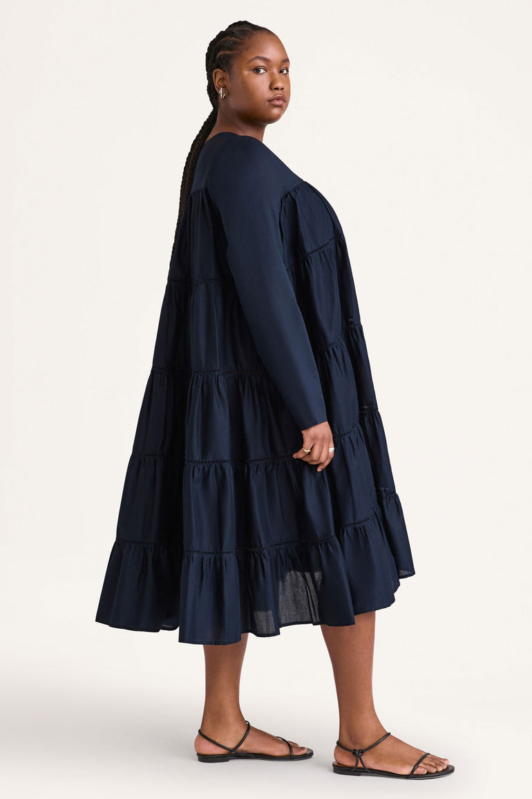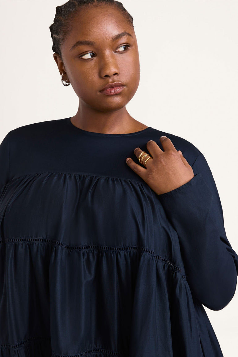 The Essaouira is a signature style with a round neck and minimal yoke and sleeves. Its tiered body, decorated with fine crochet lace trim, creates volume and movement. A mid-length offering, is it perfect for Winter layering as well as worn alone in the warmer months. Crafted in smooth 100% Pima cotton lawn.
