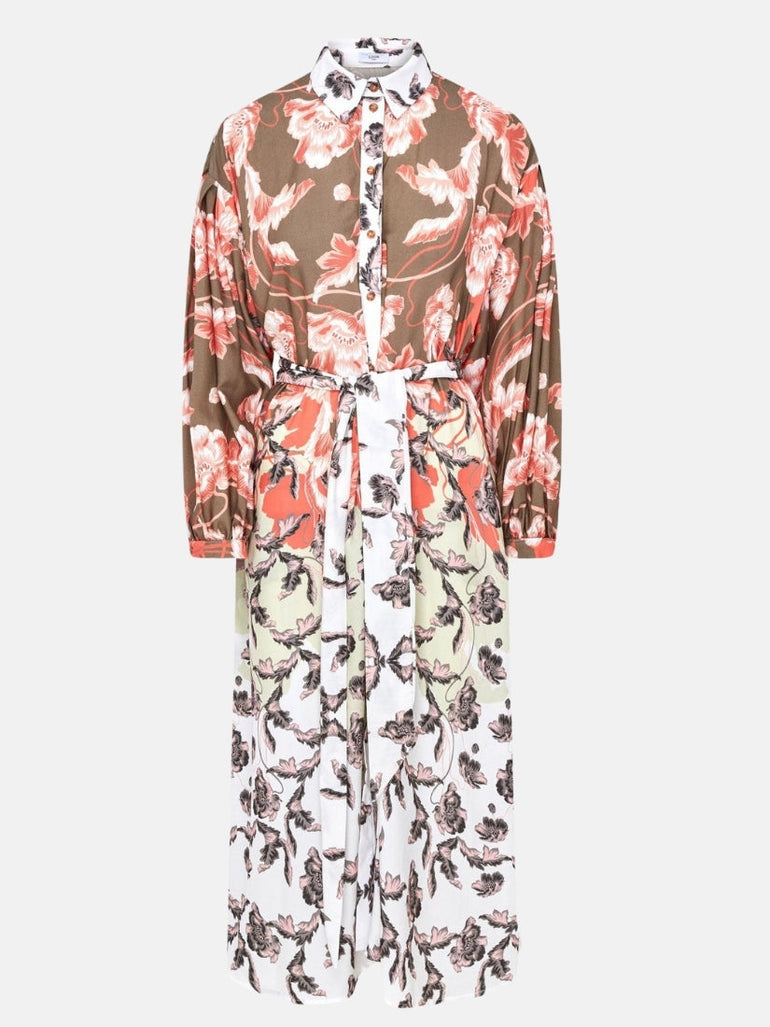Giselle High Low Hem Shirt Dress. Dropped shoulder belted dress. Crafted from lightweight and breathable viscose, this dress offers comfort and ease of wear throughout the day. The placement print design creates a visually captivating effect. With its midi length this dress strikes the perfect balance between casual and polished, making it suitable for various occasions.
