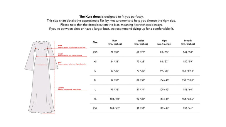 We recommend sizing up if you have a fuller bust or if you're between sizes.