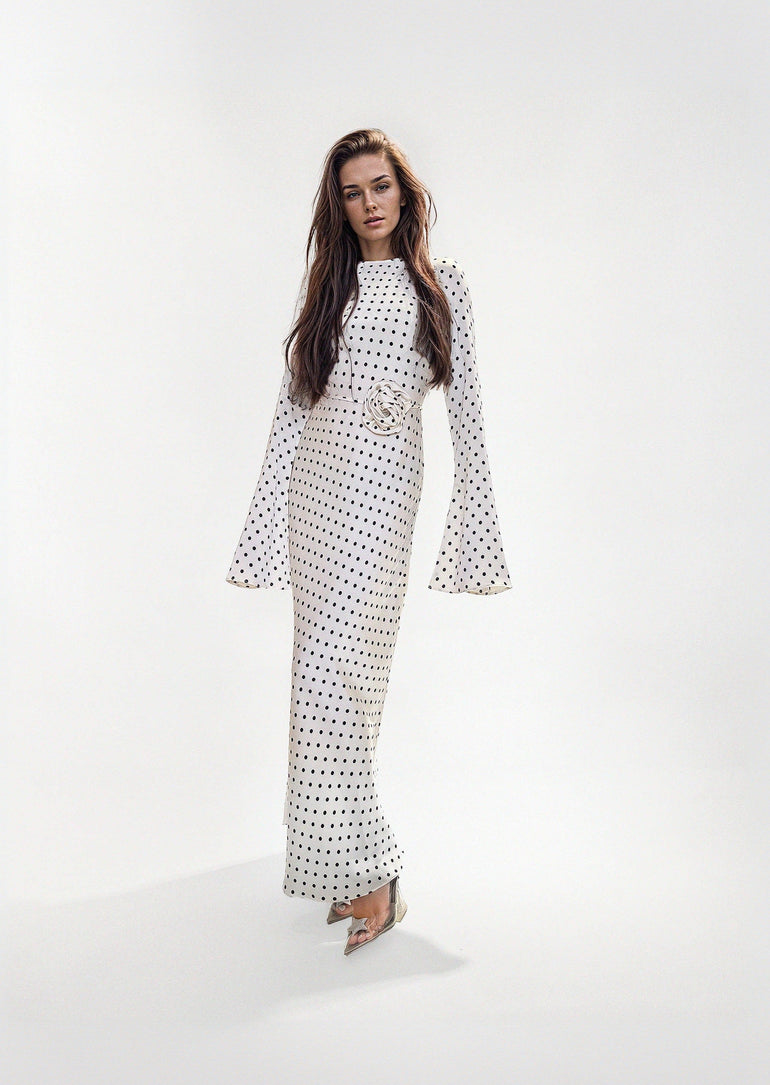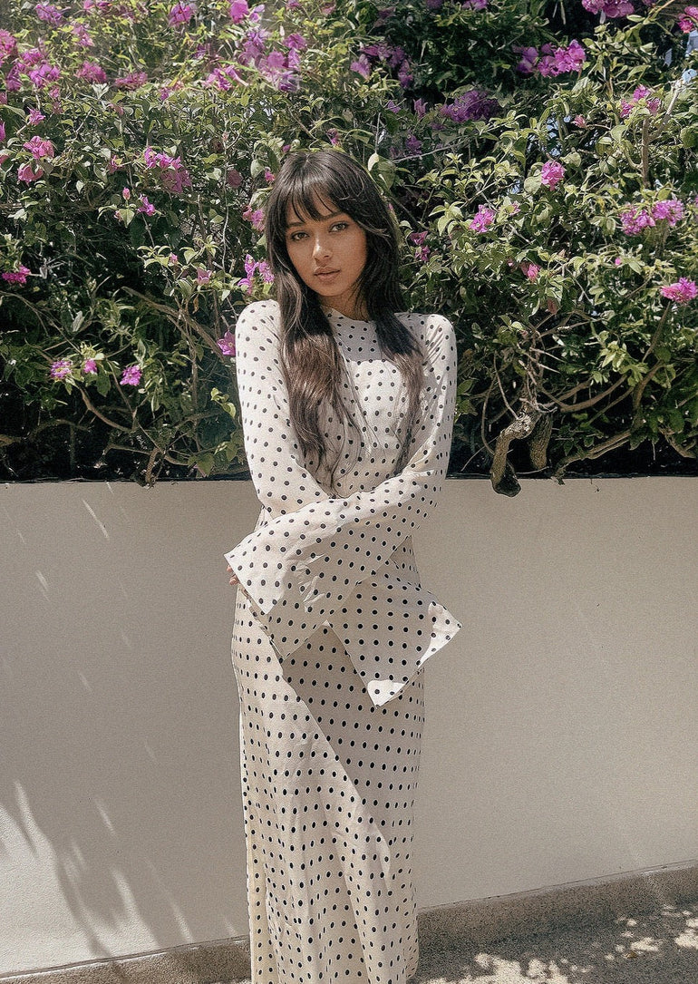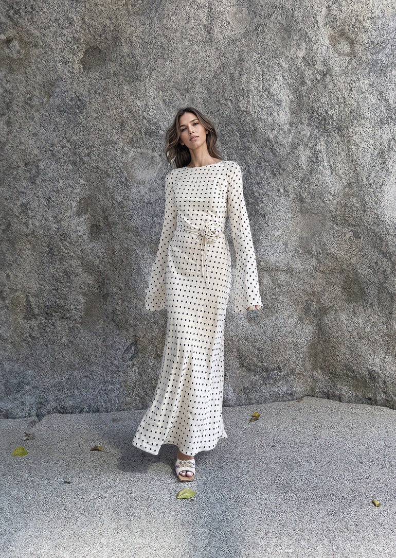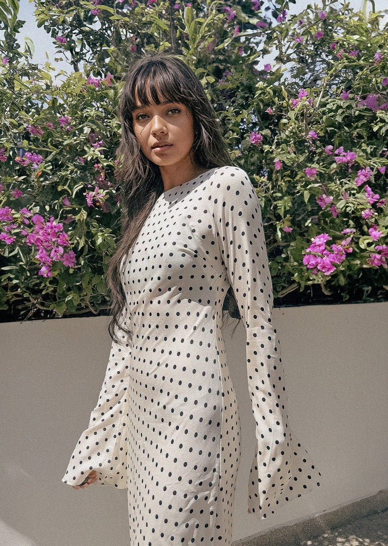 Channel the iconic 70s vibe with the Kyra Dress, a bias-cut design that beautifully highlights your figure. The statement bell sleeves and maxi length give it a flowing, elegant look that’s effortlessly chic. Pick between classic Black Polka Dots or fun White Polka Dots to perfect your vintage-inspired style.