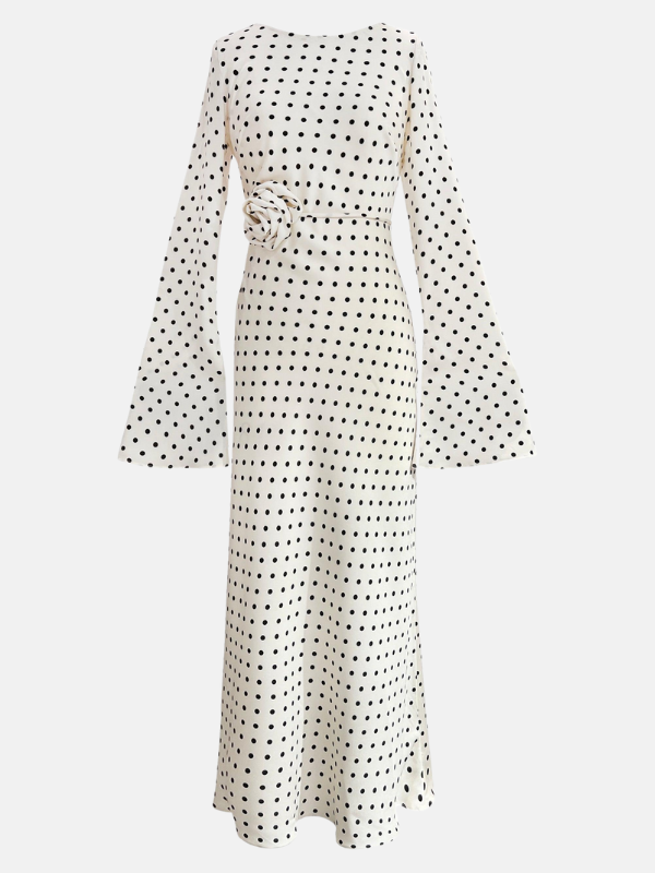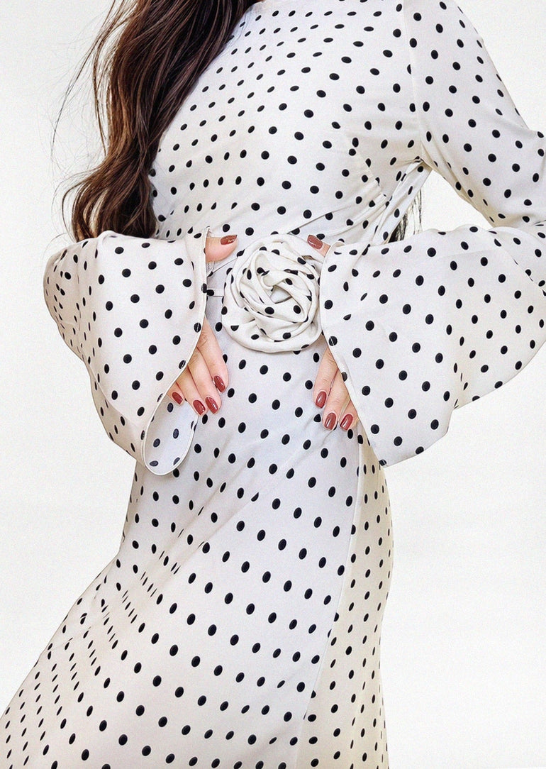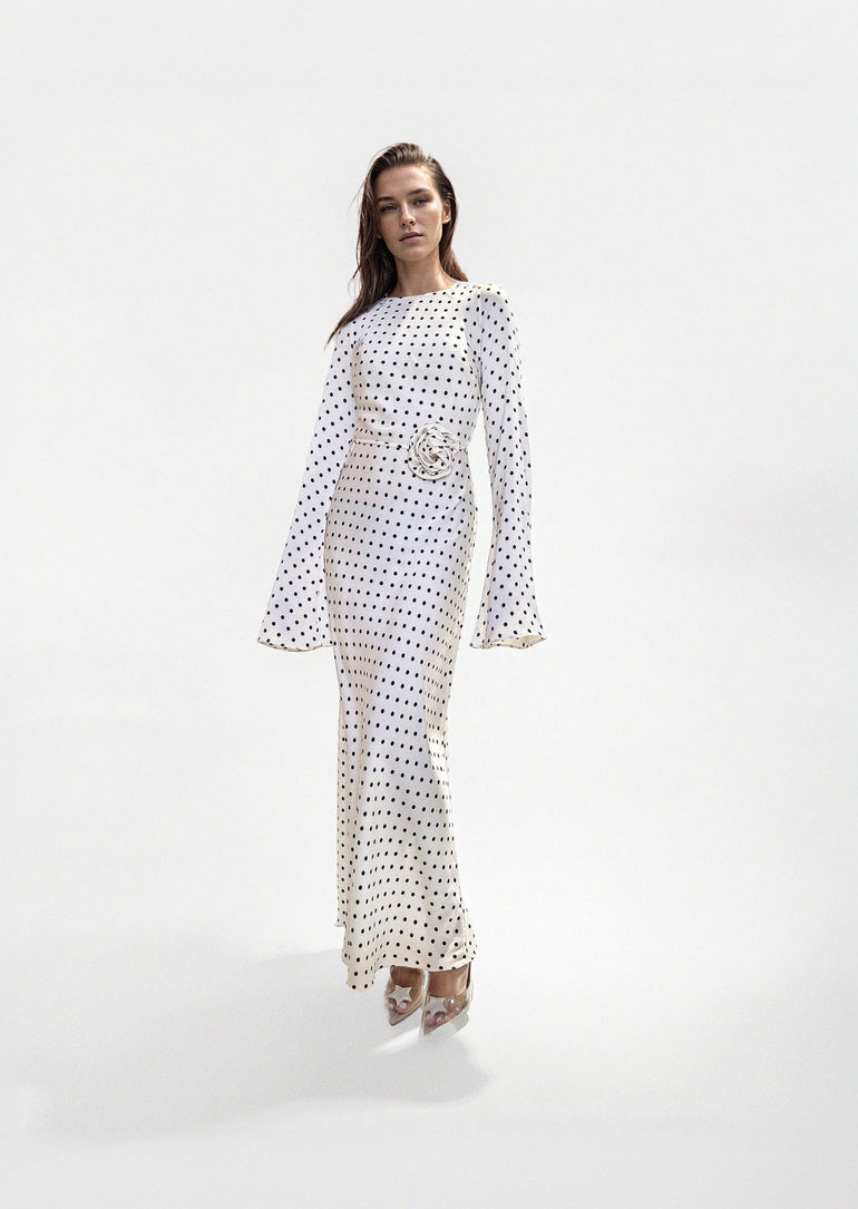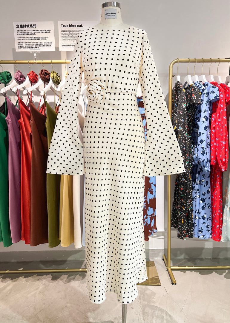 Channel the iconic 70s vibe with the Kyra Dress, a bias-cut design that beautifully highlights your figure. The statement bell sleeves and maxi length give it a flowing, elegant look that’s effortlessly chic. Pick between classic Black Polka Dots or fun White Polka Dots to perfect your vintage-inspired style.