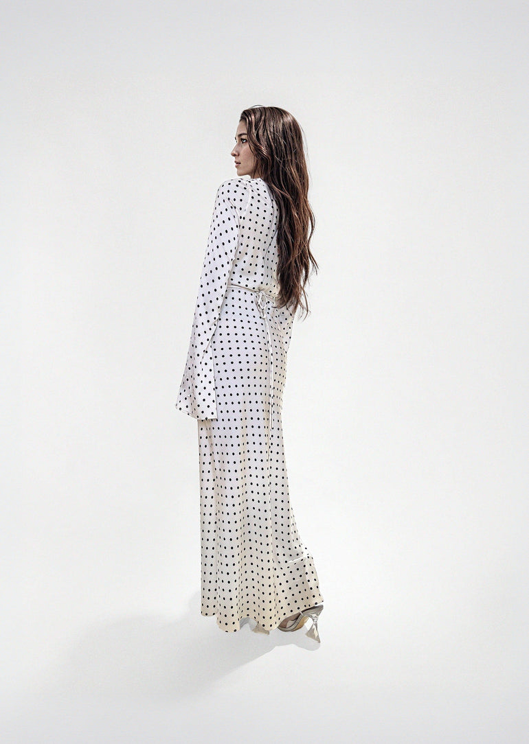 Kyra Bias Maxi Dress in White With Black Polka Dots