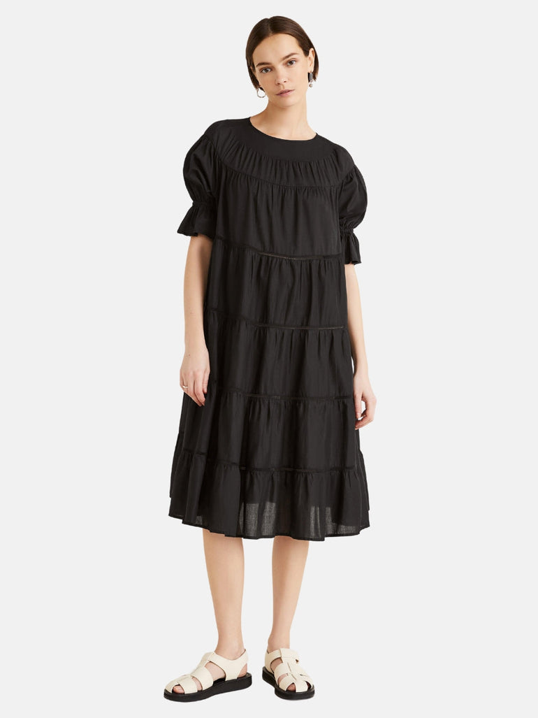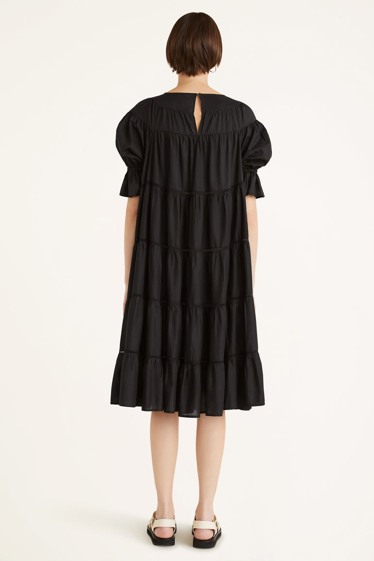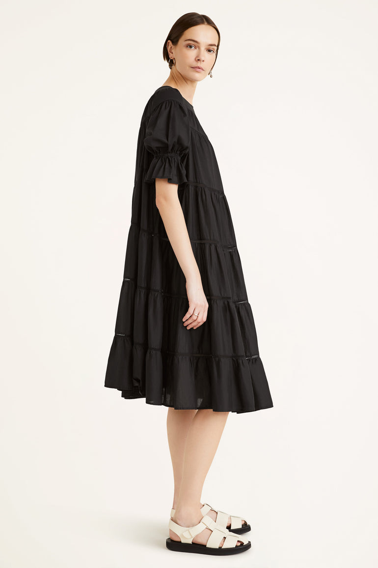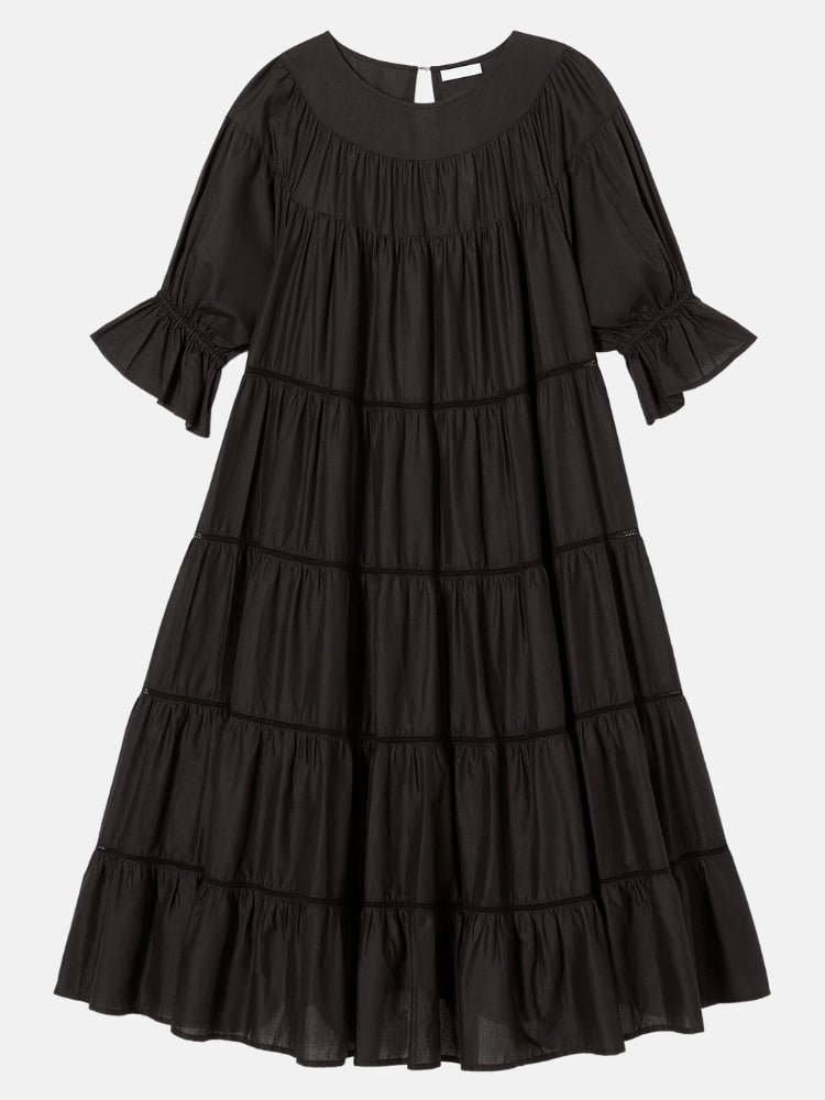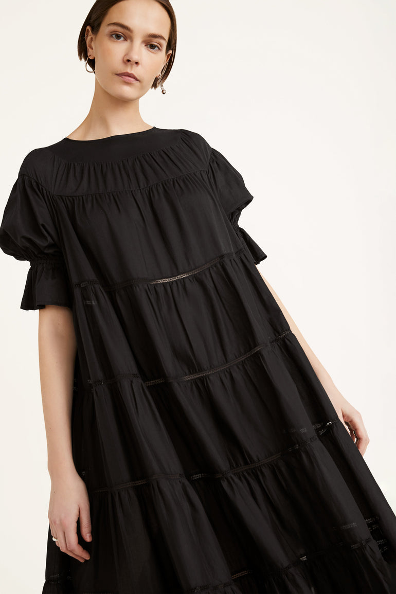 The PARADIS is a lightweight, voluminous dress in smooth 100% Pima cotton lawn. With a tiered construction embellished by crochet trim detail, it has puff sleeves with elasticated ruffled cuffs. An elegant, versatile, mid-length dress. The spacious silhouette of the PARADIS means you may wish to take a size down for a more regular fit.