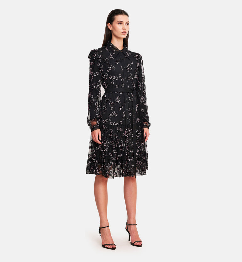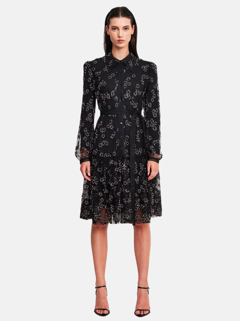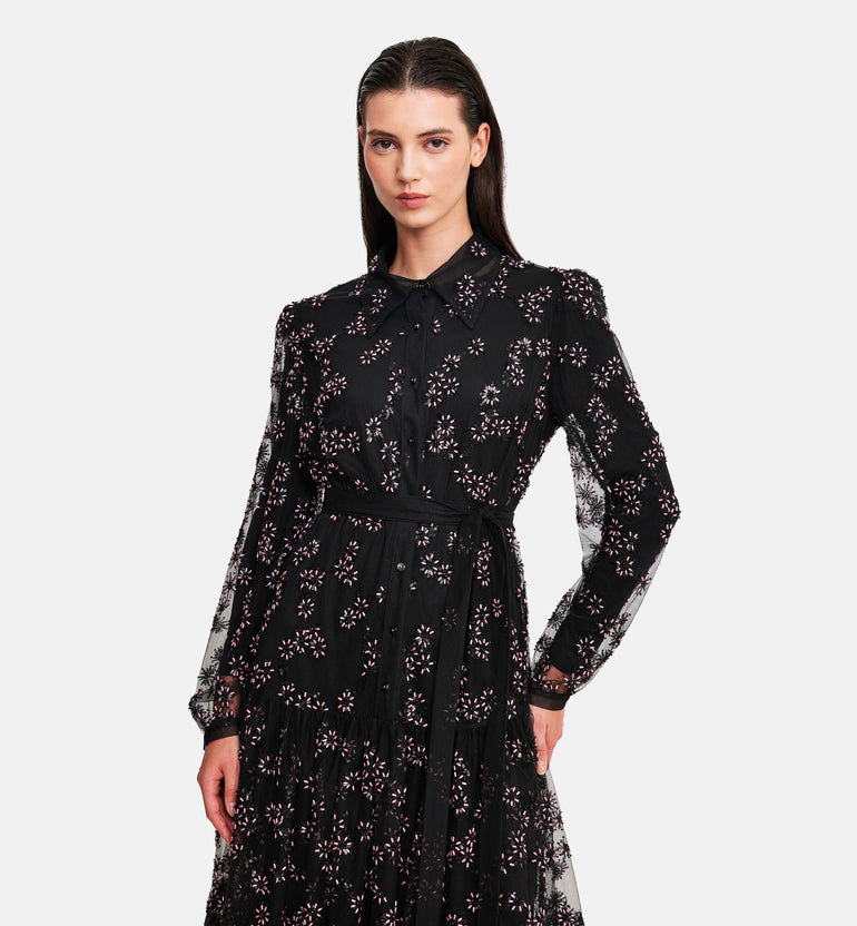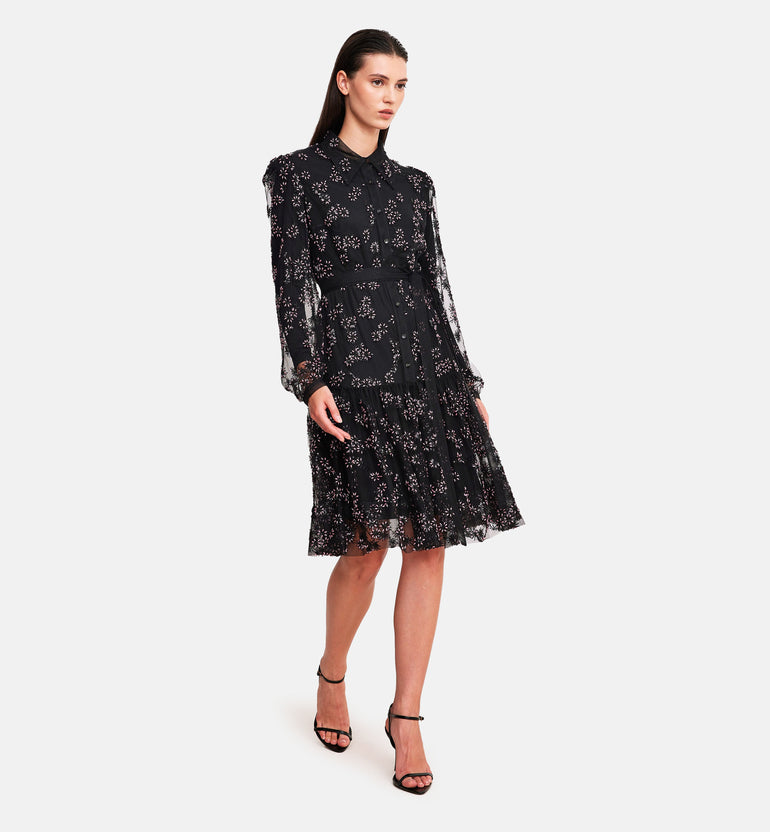 Pearls and stones on mesh buttoned dress, black