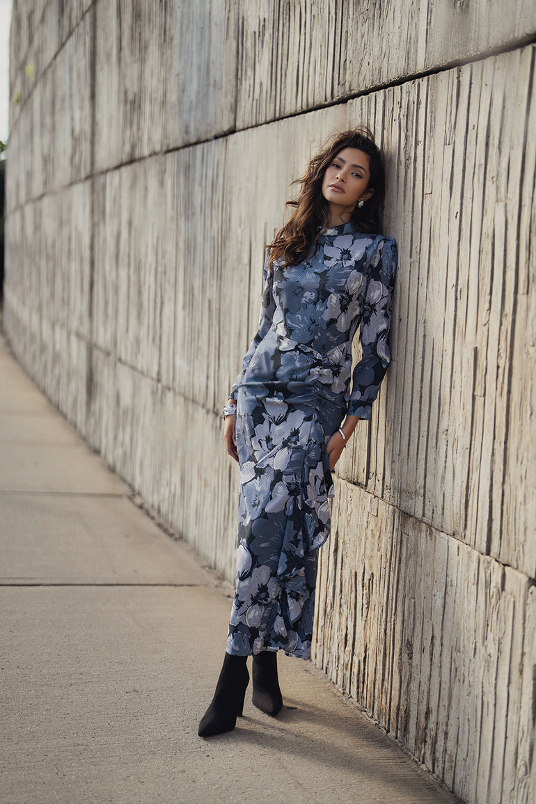 Crafted with a stunning floral blue stone print, the Printed Ruched Maxi showcases a mock neck and a graceful front side ruffle detail for an elegant, flowing silhouette.