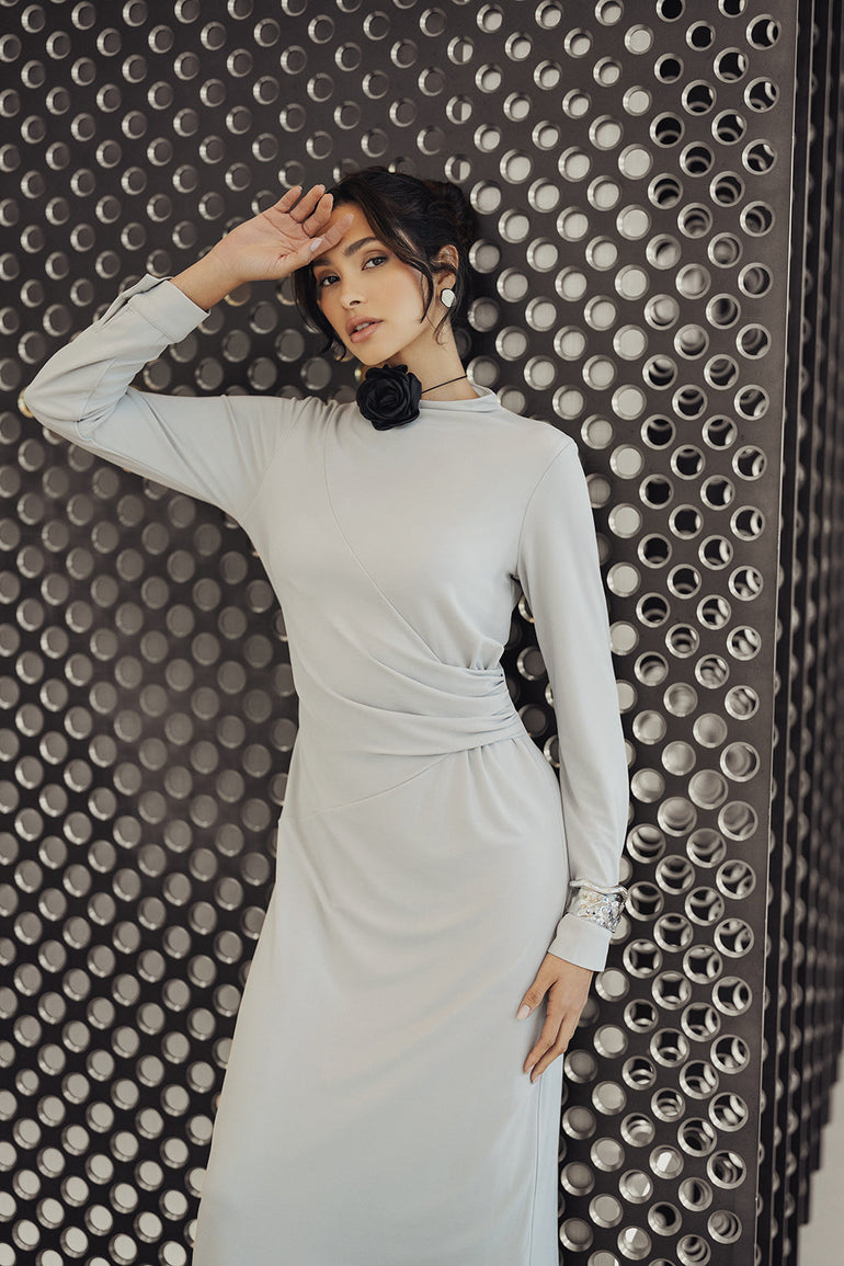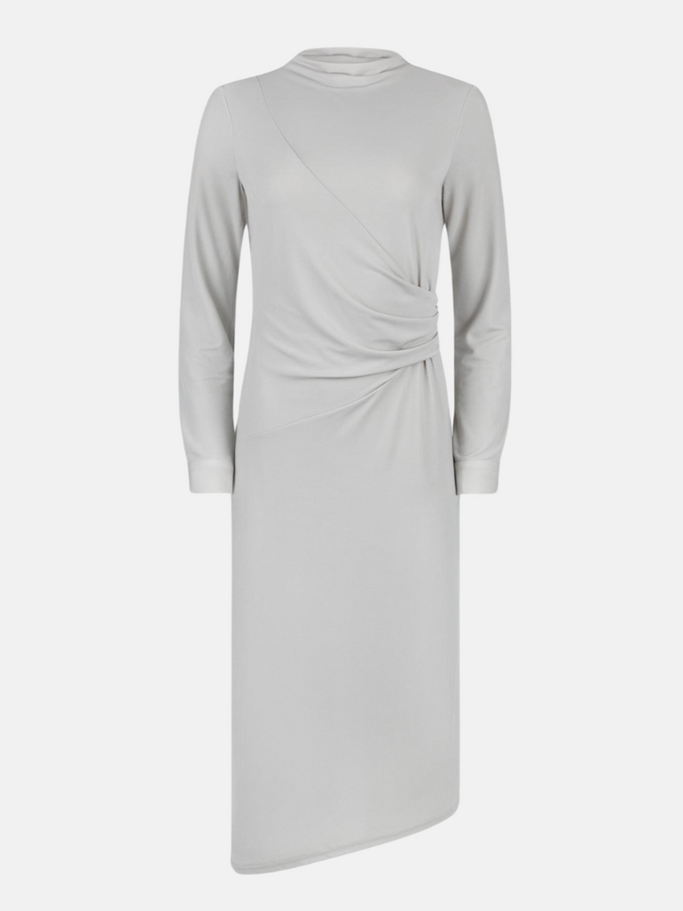 Crafted with elegant drapery, the Cinched Asymmetrical Dress features a sophisticated design with a striking silhouette and modern detailing.
