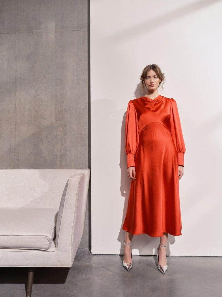 The Sadie dress has a sophisticated silhouette. Featuring a beautiful cowl neckline, long voluminous sleeves with cuff detail and slim fit midi length skirt. Made in a bold red satin fabric. Fastens at centre back with concealed zip. This dress is the perfect staple piece for the party season.
