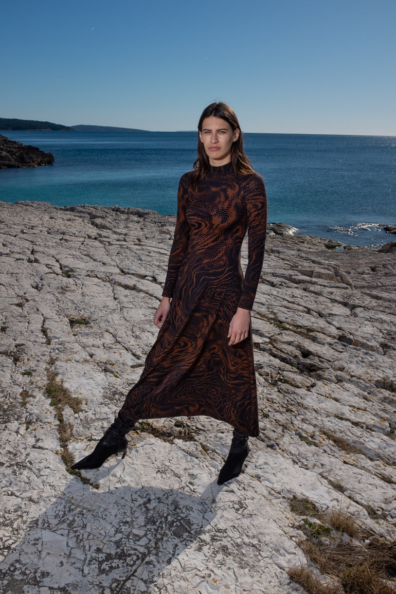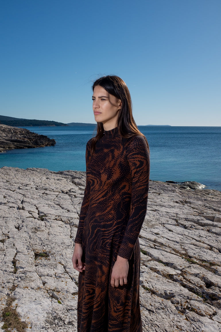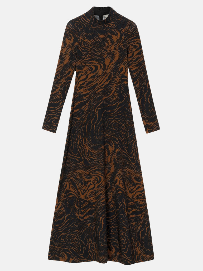 The Speculus dress is a striking figure hugging long sleeve dress crafted from soft certified organic cotton and modal jersey. Featuring custom abstract artwork Zora Black, perfect easy fit maxi silhouette with a mock neck and raglan cut sleeves, and hidden zip closure in back. Comfortable and effortless, pair yours with statement accessories and boots.