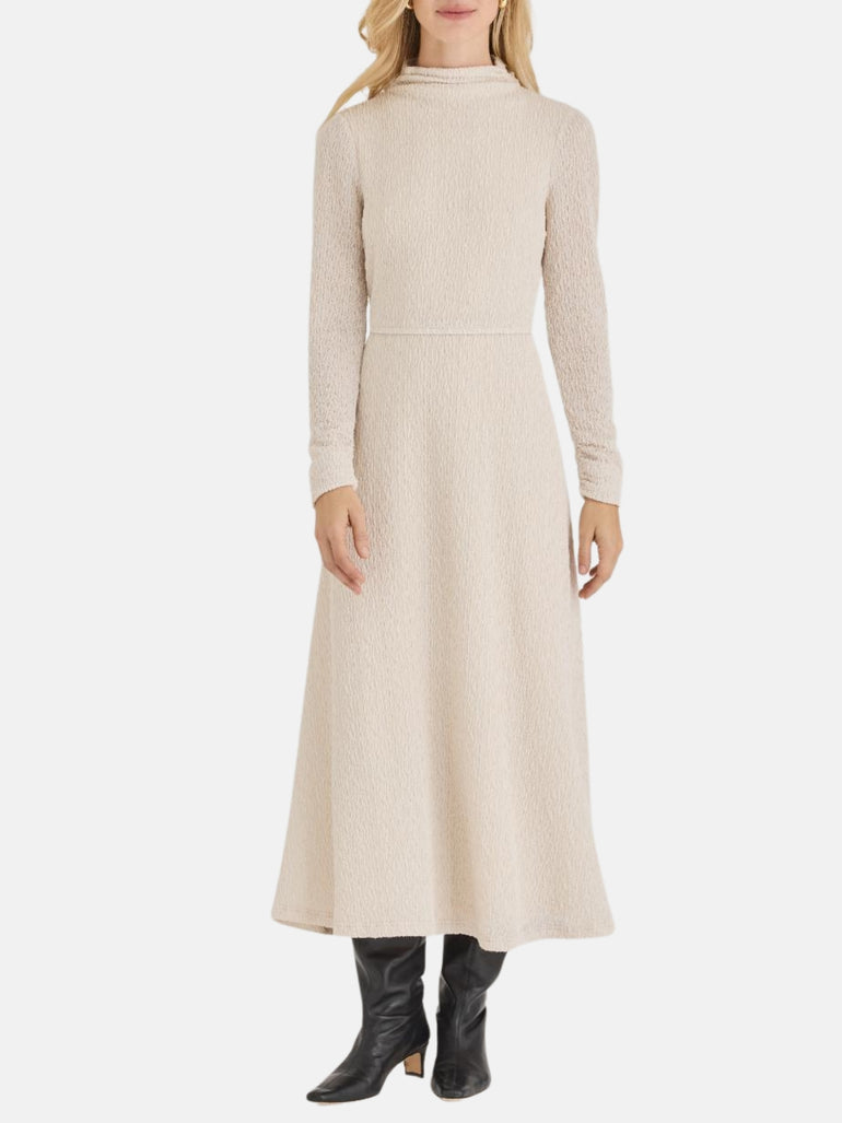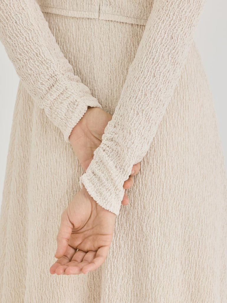 This ethereal knit lace dress in cream exudes romantic elegance with a modern twist. Crafted from Japanese stretch knit fabric, it features an alluring lace pattern that gracefully skims the figure from neck to midi hem.