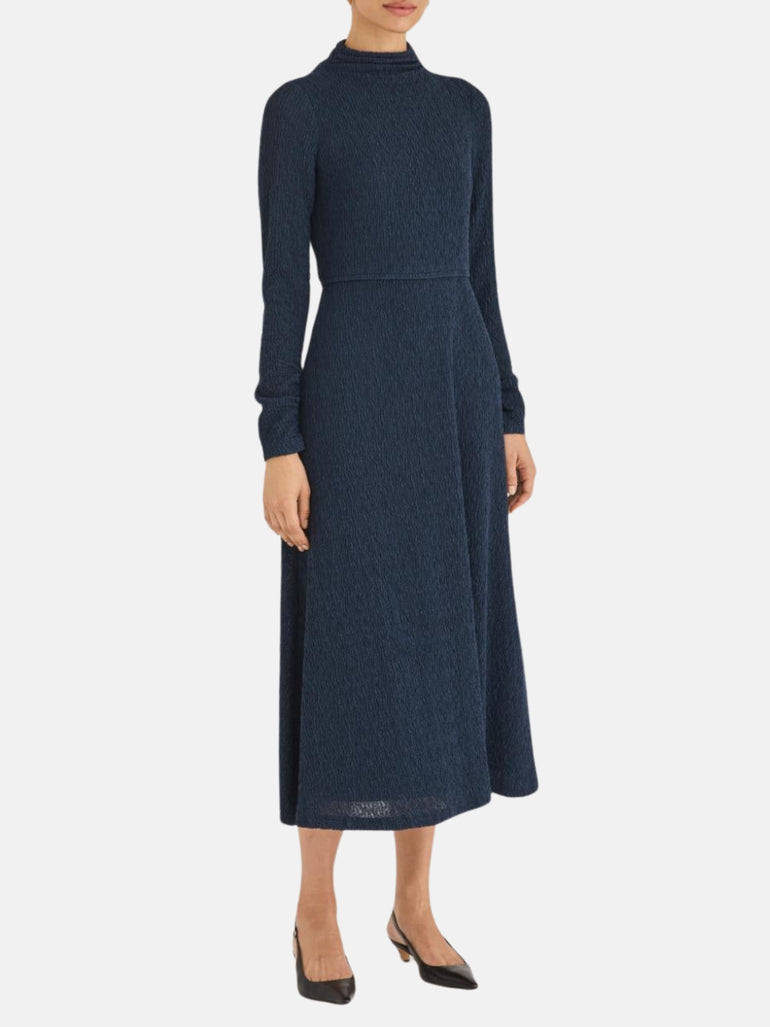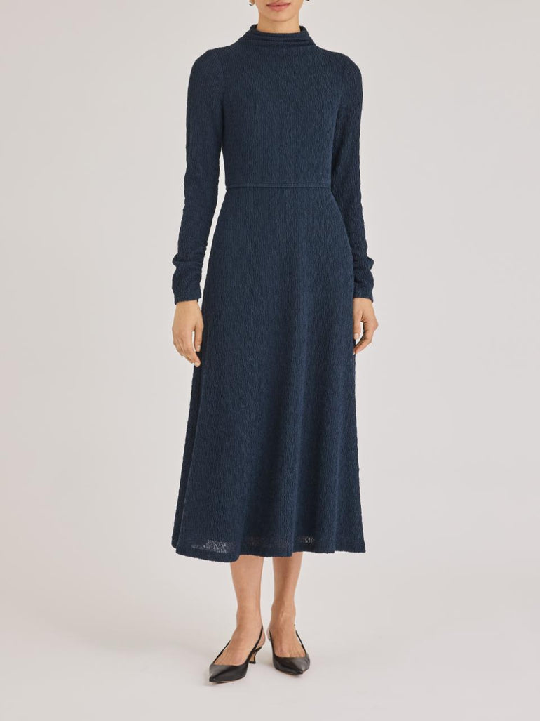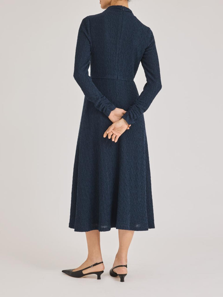 This sophisticated knit lace dress in navy seamlessly blends elegance with sustainability. Featuring a body-skimming silhouette crafted from Japanese stretch knit fabric, it offers a timeless appeal with its intricate lace pattern and midi length.