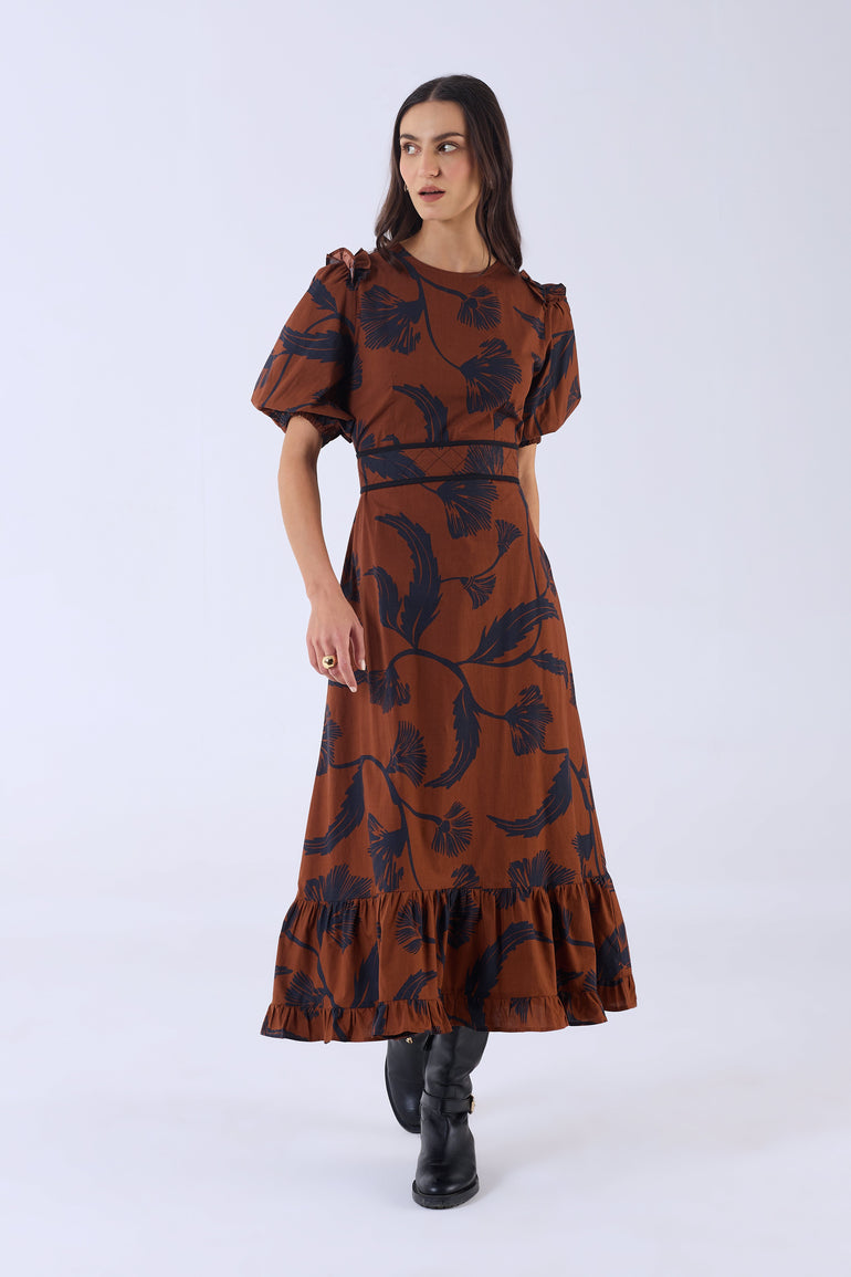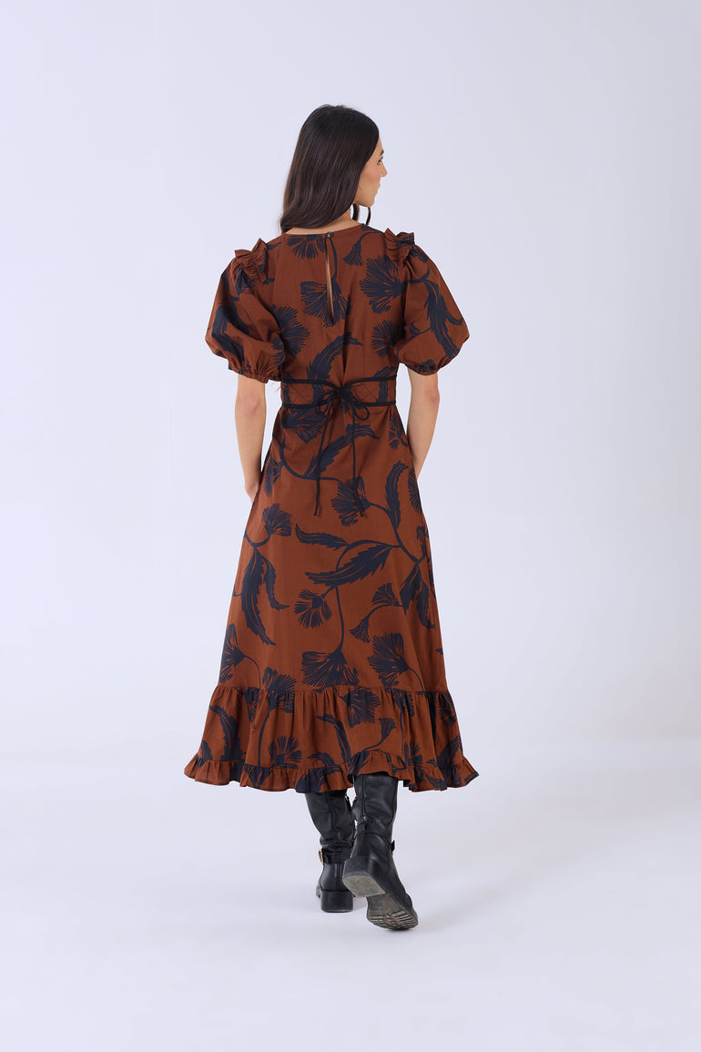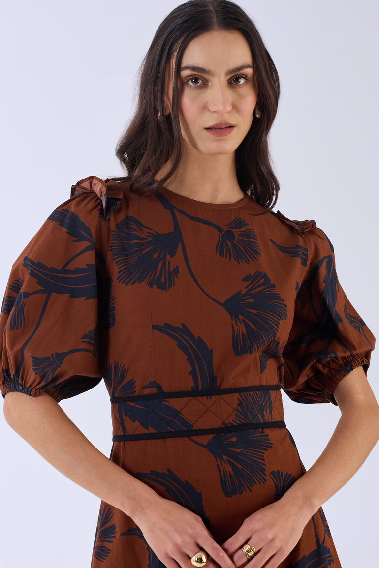 The Antonia is a wonderful choice for special occasions and everyday agendas alike. Cut with puffed sleeves, elastic cuffs and adorned with subtle frills, the Antonia falls to a slender A-line creating a flattering silhouette. Accentuate the waist with the featured belt. Antonia is crafted from crisp cotton poplin, breathable and soft against the skin. ‘Noir Bloom’ captures the graceful interplay of shadows formed by leaves and florals under the fading light of the setting sun.