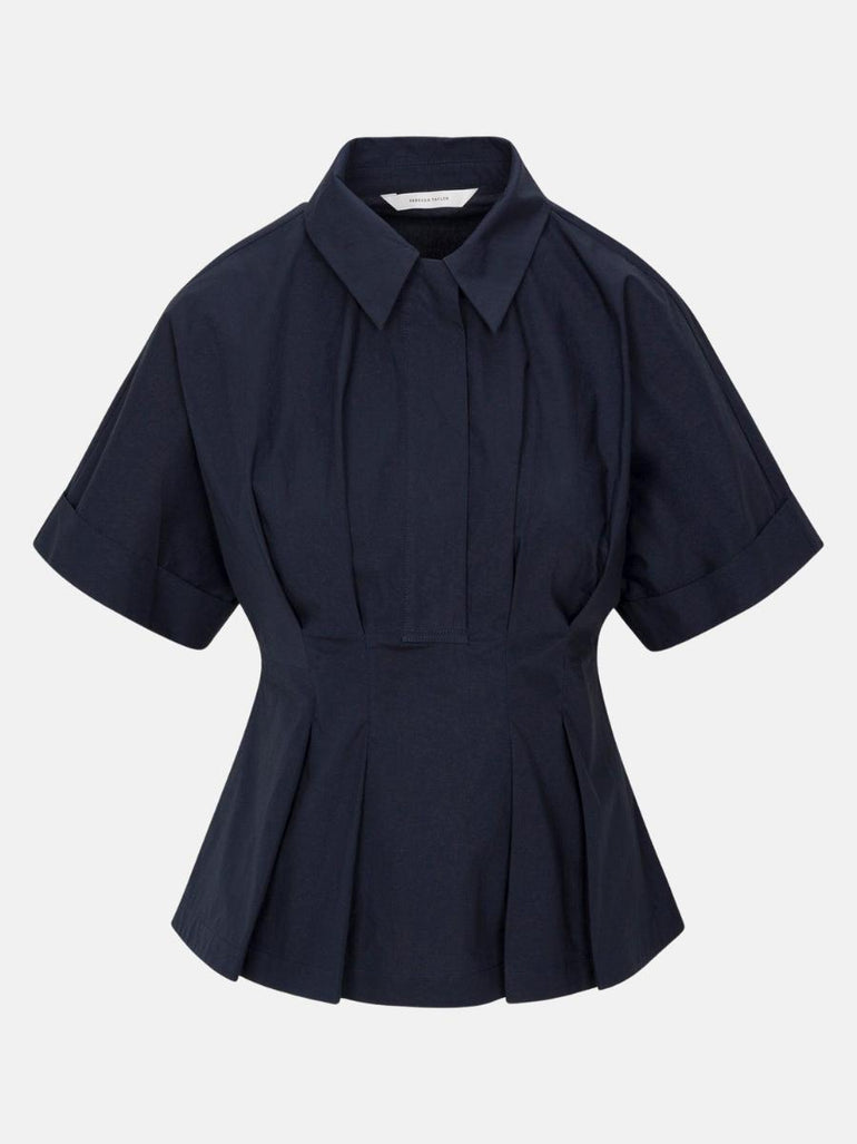 An updated take on one of our best-selling silhouettes, now in a new navy. Cut from crisp cotton poplin, this tailored short-sleeve peplum top features sharp pleats through the waist for structure and shape. The fit is clean and flattering. Wear it with wide-leg denim, tailored trousers, or layered under a jacket—it's easy to style and made to work hard in your wardrobe.