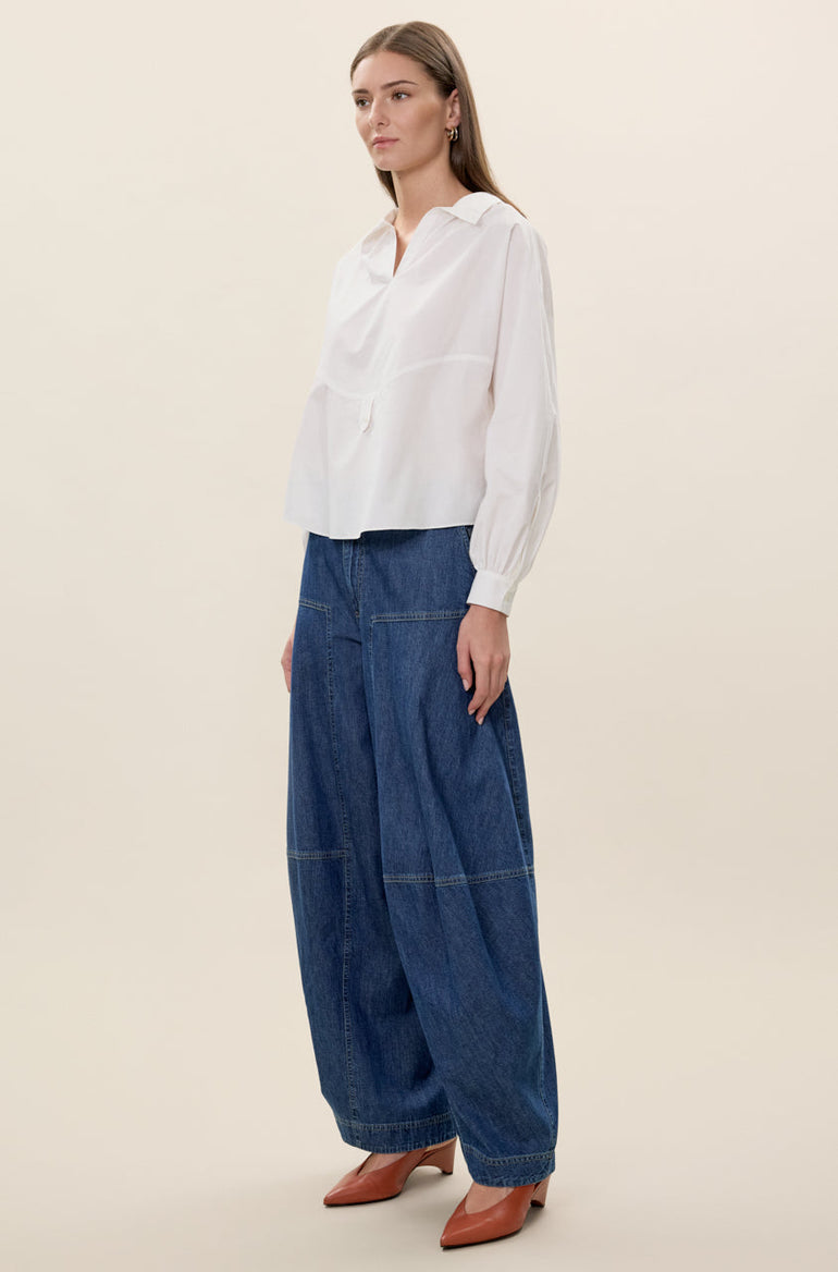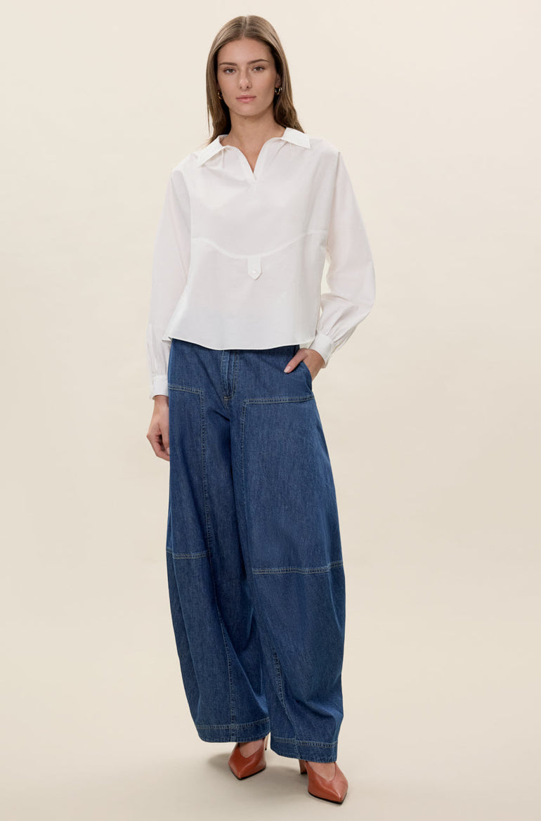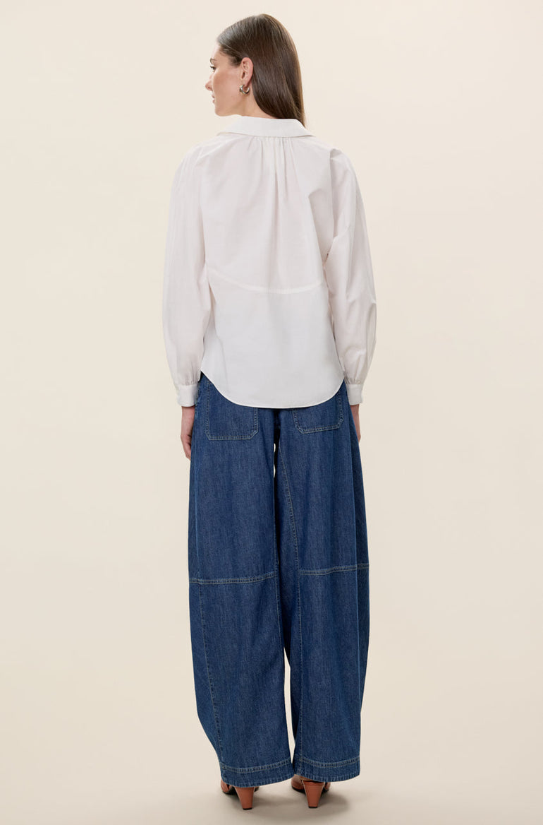 A crisp cotton poplin blouse designed with soft structure and refined ease. The open neckline is framed by a gently curved collar, bringing a subtle femininity to the clean silhouette. Full sleeves with pleated volume and tailored cuffs add quiet detail. Available in white and chambray, it’s an easy staple that pairs well with denim, trousers, or layered under a jacket.
