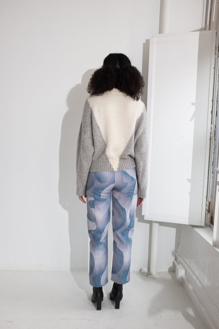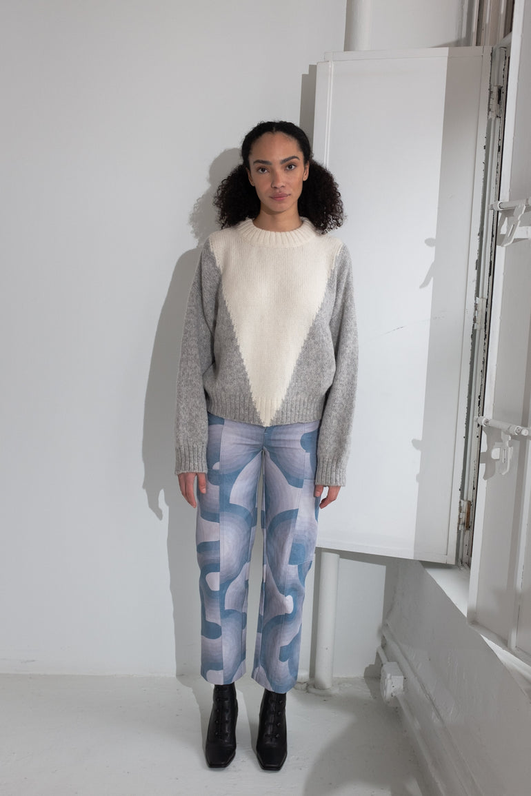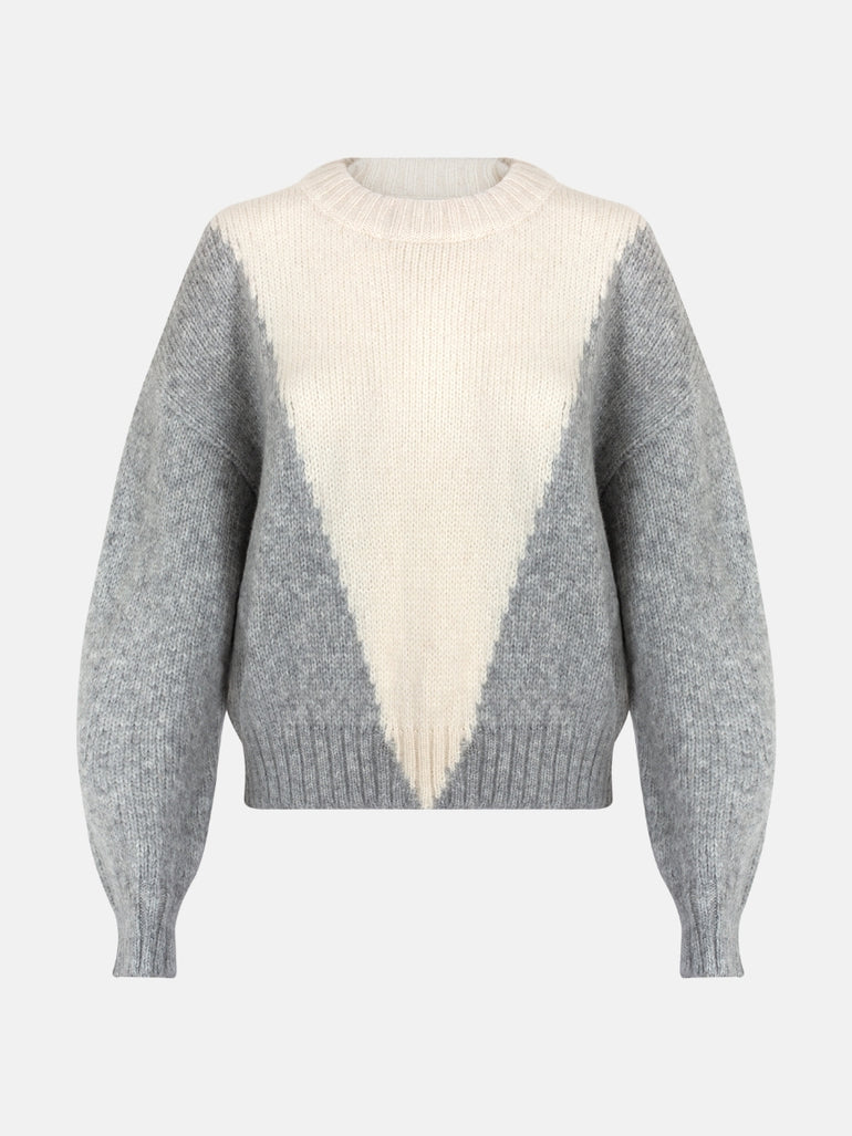 The Folari sweater is a cozy, relaxed knit crafted from baby alpaca, recycled polyamide, and merino wool. Featuring minimalist color-block intarsia design in heather grey and cream combo, Folari has a crew neck line and wide ribbed trims. Pairs perfectly with everything from jeans to tailor bottoms or layered over dresses.