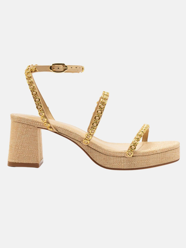Step into the warmer months ahead with a chic but chunky sandal that combines all of our favorite elements. Its sturdy square heel offsets thin, barely-there straps on this versatile beige raffia sandal that pops any time of year.