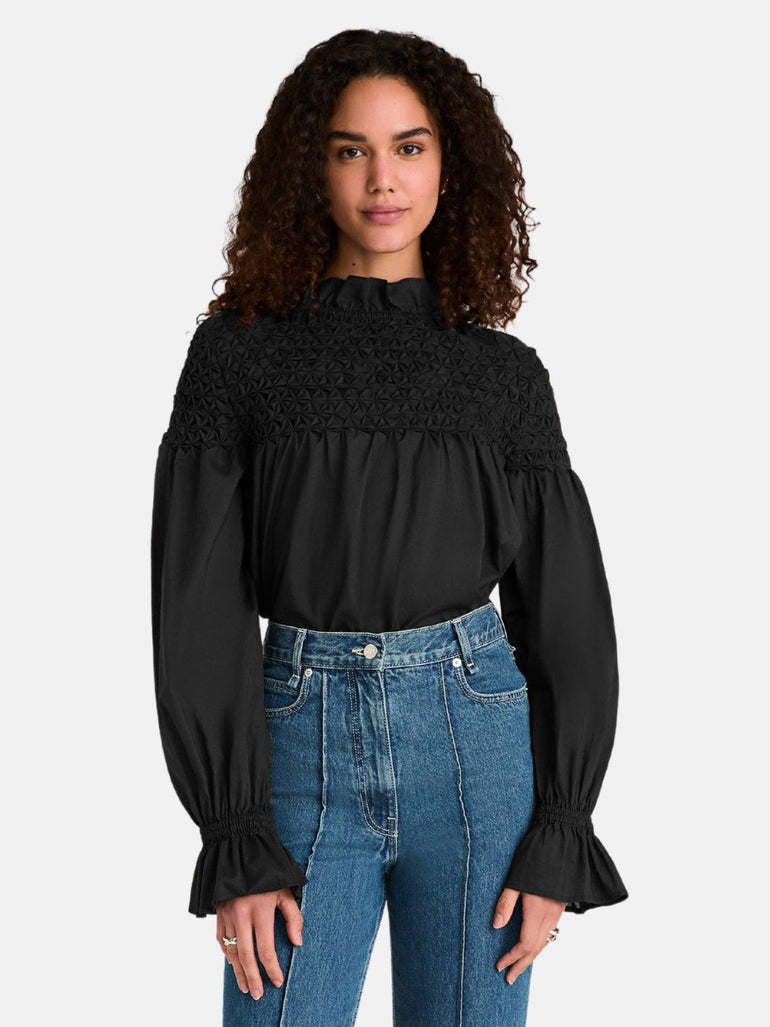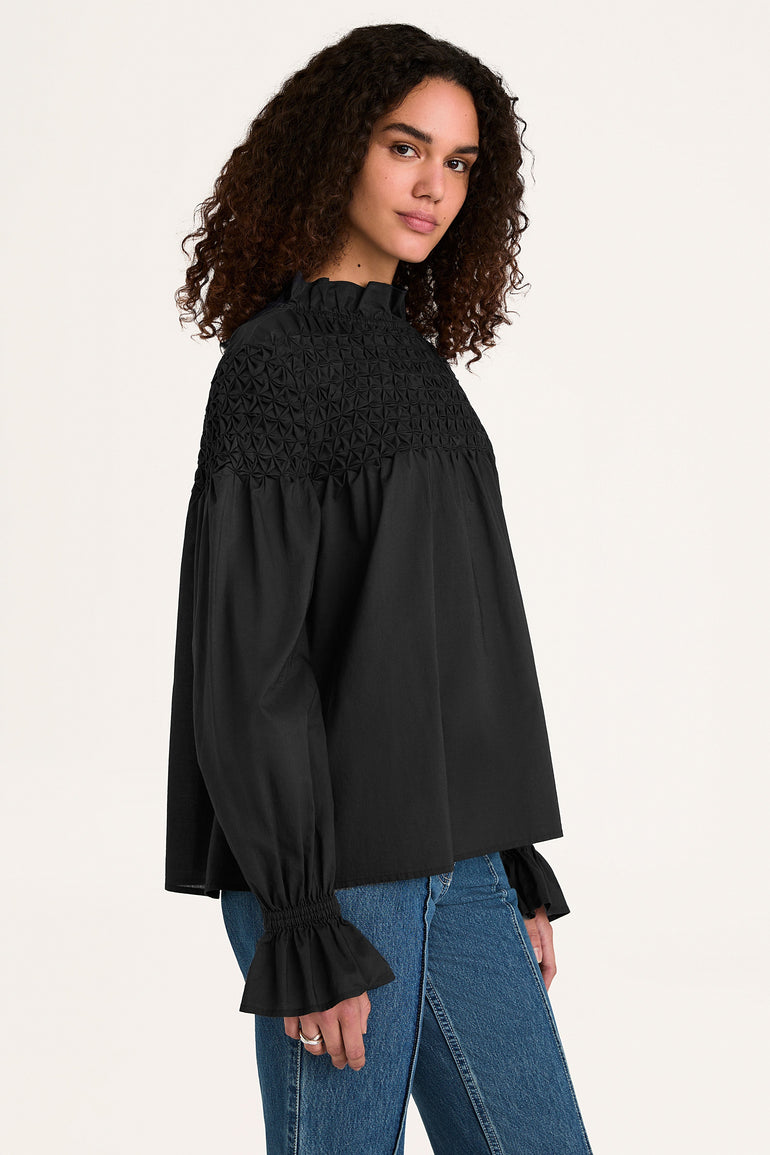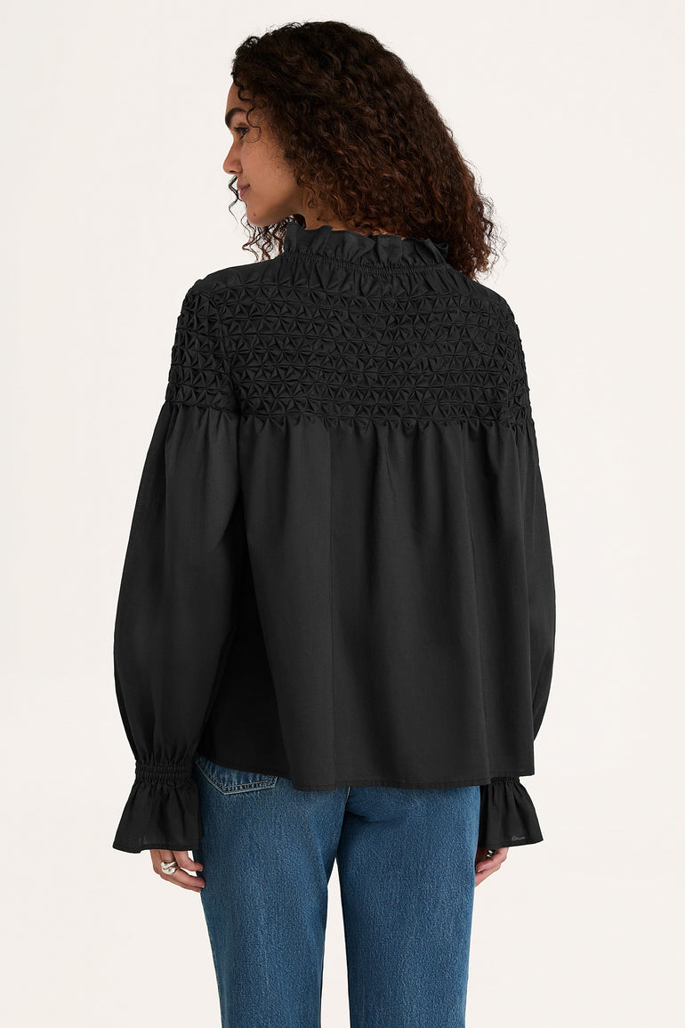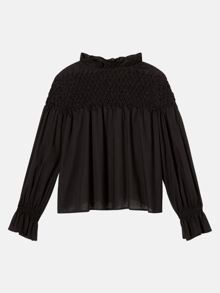 The Majorelle top is our bestselling blouse style. It has a hand smocked yoke and elasticated ruffled collar and cuffs that create a romantic, historical feel. A voluminous offering that can be worn either loose, or tucked into form fitting pants or skirts. Crafted in smooth 100% Pima cotton lawn that has a slight sheen.