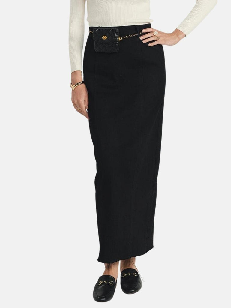 Sleek and versatile, the Straight Panel Denim Skirt in black is a timeless staple for your wardrobe. Cut in a flattering straight silhouette, this maxi-length skirt is designed with clean paneling for a polished finish. Made from structured denim, it offers a modern twist on a classic style, perfect for both casual and elevated looks.